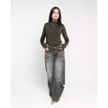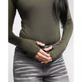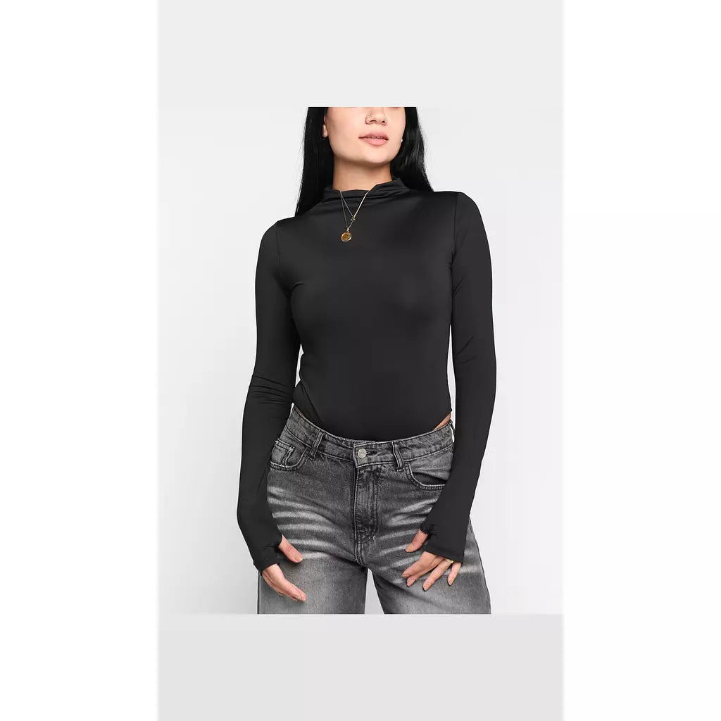 Form-fitting long-sleeve bodysuit with a wide turtleneck and cozy thumbhole details.