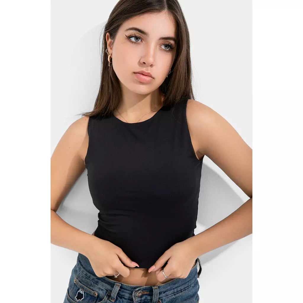 Fitted sleeveless cropped top with a fully double-layered front for added coverage.